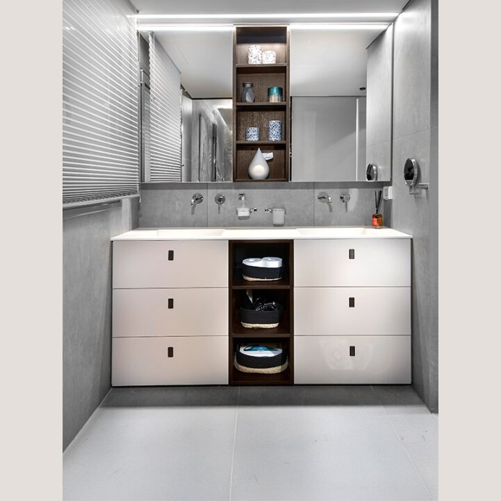 ארון מגירות עד הרצפה בגימור אפוקסי מט, בעיצוב מינימליסטי ונקי המעניק לחלל מראה מודרני ומוקפד. במרכזו שולבה נישה מפורניר טבעי, המוסיפה חמימות, עומק וטקסטורה עשירה - ויוצרת משחק חומרים אלגנטי ומרשים.