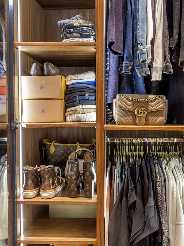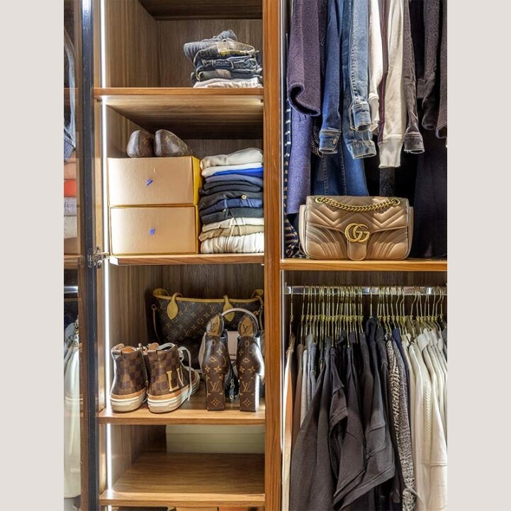 ארון בהתאמה אישית עם פנים עשוי פורניר יוקרתי לבחירה, המעניק לחלל חמימות טבעית ומראה עשיר. חזית הארון מעוצבת בדלתות זכוכית שקופות או מעושנות, עם מסגרות אלומיניום אלגנטיות ליצירת מראה מודרני, נקי ובעל נוכחות אדריכלית.