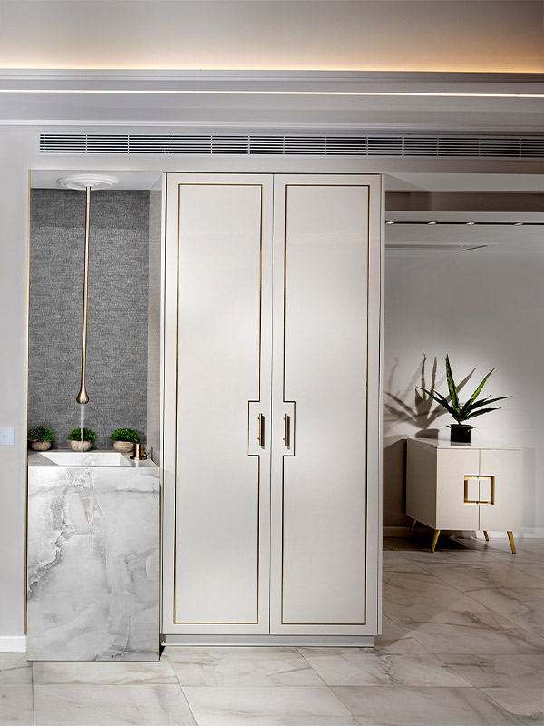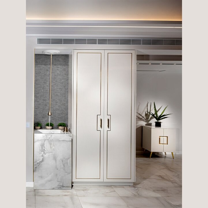 ארון מעוצב עם דלתות בגימור אפוקסי מט, בשילוב חריצי CNC מדויקים ופסי זהב אלגנטיים ליצירת מראה עשיר ומלא עומק. ידיות המתכת משלימות את העיצוב עם נגיעה מודרנית יוקרתית.