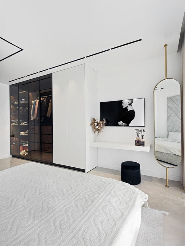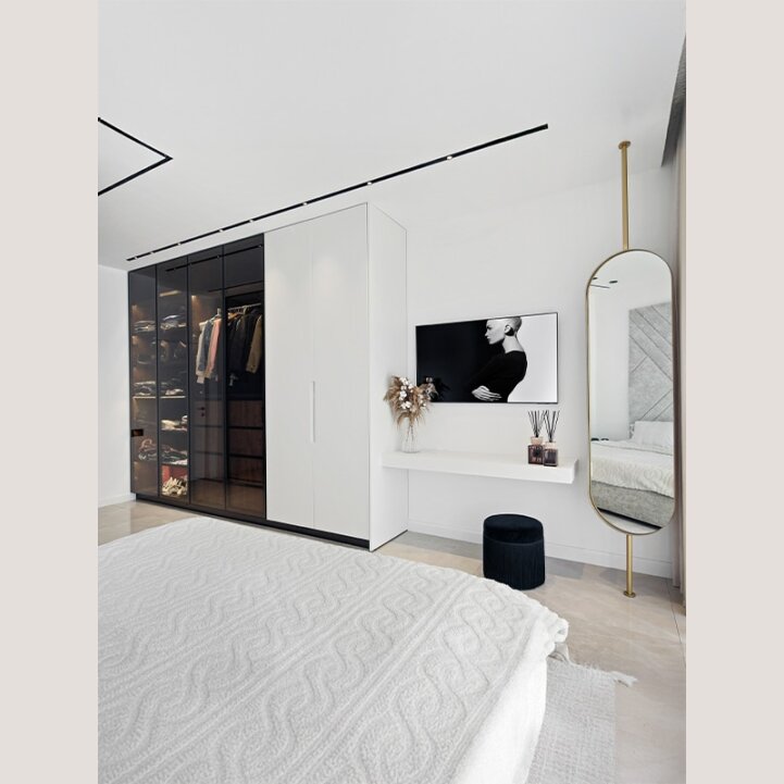 ארון אפוקסי מט בעיצוב מודרני ונקי, משולב בדלתות זכוכית מעושנת בגוון אפור ליצירת מראה עשיר, אלגנטי ובעל עומק. הזכוכית המעושנת מוסיפה נגיעה יוקרתית ומאפשרת חשיפה עדינה של הפנים, בעוד גימור האפוקסי מבטיח חזות חלקה, מאוזנת ומינימליסטית.