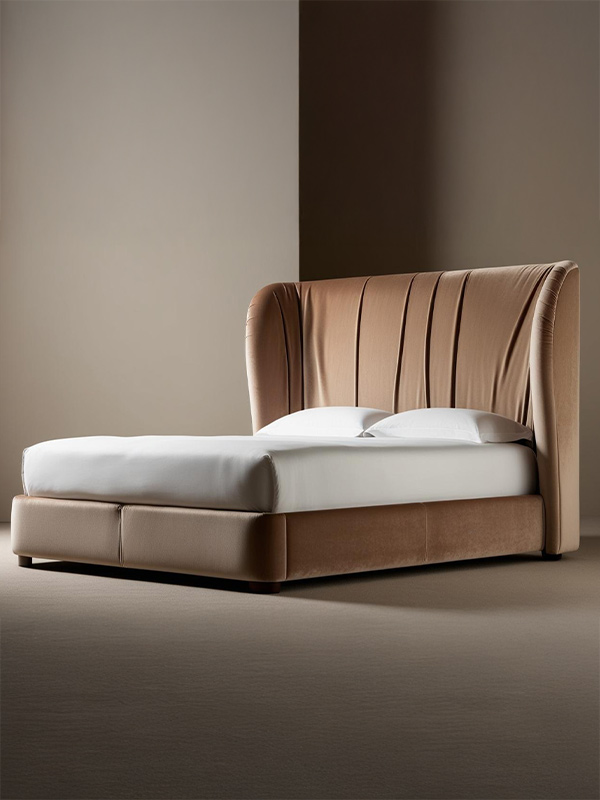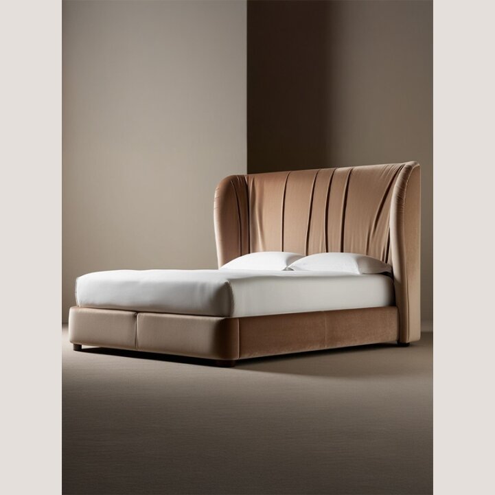 מיטה יוקרתית בעיצוב נקי ומודרני, מרופדת בבד איכותי המעניק לחלל מראה אלגנטי, חמים ומעודן. שילוב החומרים המובחרים, הגימור המדויק והפרופורציות המאוזנות הופכים את המיטה לפריט מרכזי ומרשים בחדר השינה.