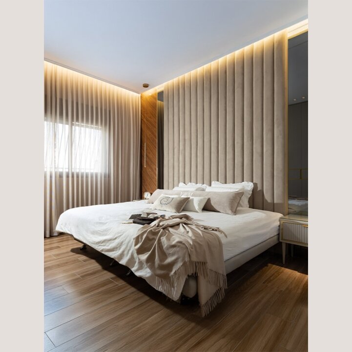 חלל שינה יוקרתי בעיצוב מודרני המאופיין בחיפוי קיר מרהיב, המשלב מראות ונגרות בהתאמה אישית מלאה. אלמנטים אלו יוצרים תחושת עומק, יוקרה וייחודיות, ומעניקים לחדר אופי אדריכלי מובחן.