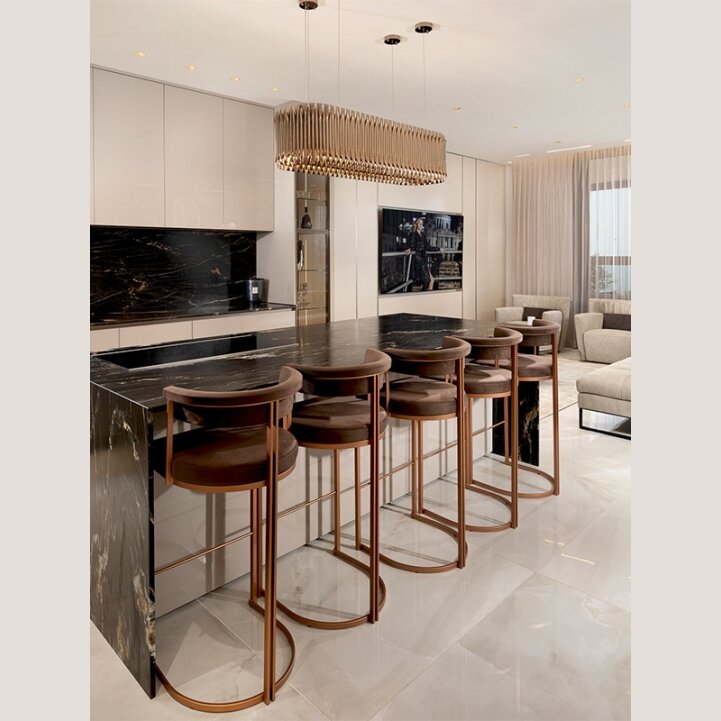 כיסא בר מרופד בעיצוב מודרני ונקי, עם רגלי ברזל חזקות המעניקות מראה אלגנטי ותעשייתי כאחד. ריפוד הבד האיכותי מספק נוחות גבוהה ותחושת יוקרה, בעוד המבנה היציב מתאים לשימוש יומיומי ולחללים מעוצבים ברמה גבוהה.