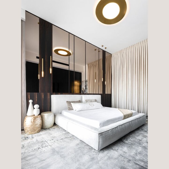 חדר שינה מעוצב בהתאמה אישית, עם חיפוי קיר מרהיב המשולב בנגרות מוקפדת ומראות היוצרות עומק, ברק ואווירה אדריכלית יוקרתית. המיטה מרופדת בבד איכותי ופרקטי לפי בחירה, עם גימור מדויק וקווים נקיים המשלימים מראה הרמוני, מודרני ועשיר.