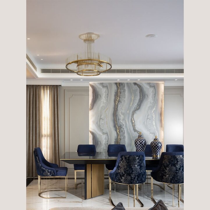 העיצוב המוקפד, הברק האלגנטי והקונטרסט בין השחור לזהב הופכים את השולחן למוקד מרכזי בחלל האוכל — מושלם לבתים המעוצבים בסטנדרט גבוה.