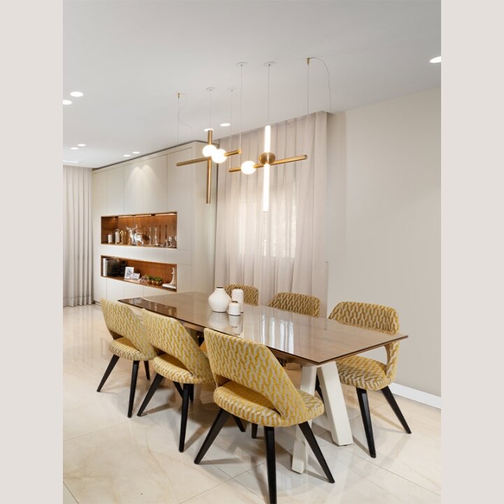 השילוב בין חומר טבעי לגימור מבריק יוצר שולחן על־זמני שמאיר את החלל ומוסיף לו תחושת יוקרה אדריכלית — פריט מושלם לחללים המעוצבים בקפידה.