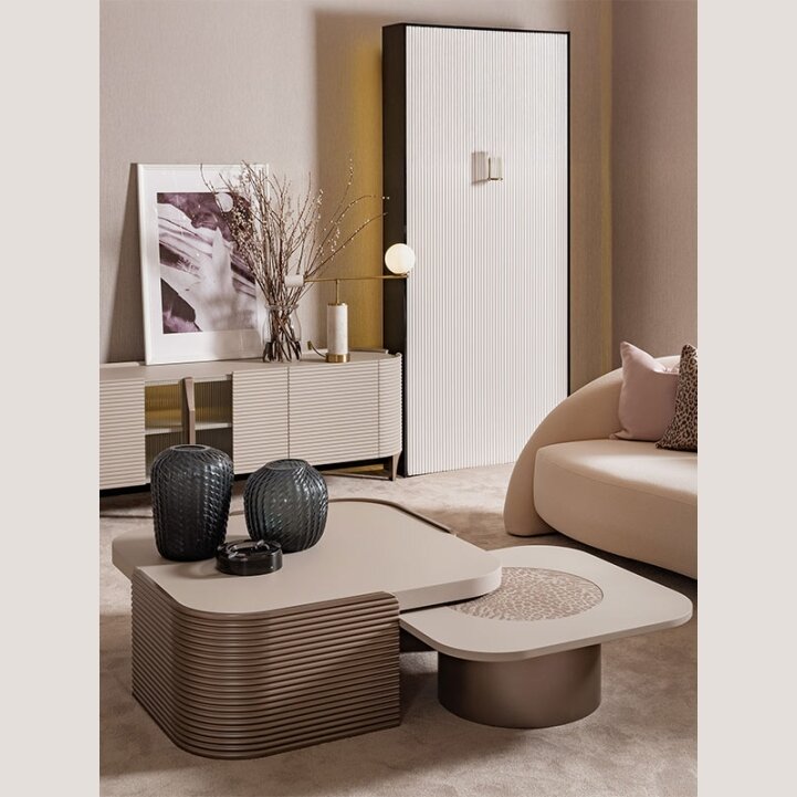 צמד שולחנות סלון מעוגלים בעיצוב ייחודי, המשלבים גוונים וחומרים ליצירת מראה אומנותי, מודרני ומלא סטייל. הצורות המעוגלות והפרופורציות המדויקות מעניקות לחלל תחושת רכות ואלגנטיות, בעוד שילוב הצבעים מוסיף עומק וייחודיות עיצובית.
