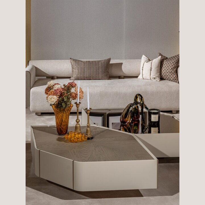 צמד שולחנות סלון בעיצוב מרשים, הכולל שולחן אחד עם פלטת פורניר ייחודי בעל טקסטורה עשירה, ושולחן נוסף עם פלטת מראה אלגנטית היוצרת עומק וברק יוקרתי בחלל. השילוב בין החומרים השונים יוצר קומפוזיציה מודרנית, מאוזנת ומלאת נוכחות - פריט אידיאלי לסלון המעוצב בקפידה.