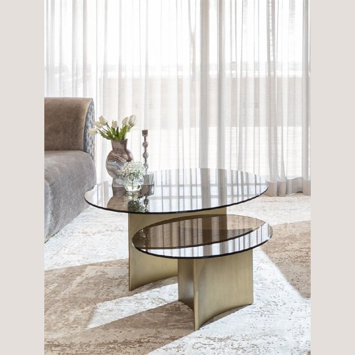 זוג שולחנות סלון בעיצוב מודרני, עם פלטות זכוכית חומה מעושנת בצורת אובל אלגנטית ורגלי ״פרפר״ מעוצבות המוסיפות נוכחות אדריכלית מרשימה. השילוב בין הזכוכית המעושנת למבנה הרגליים יוצר מראה יוקרתי, מעודן ומלא סטייל - מושלם לסלון בעיצוב מוקפד.