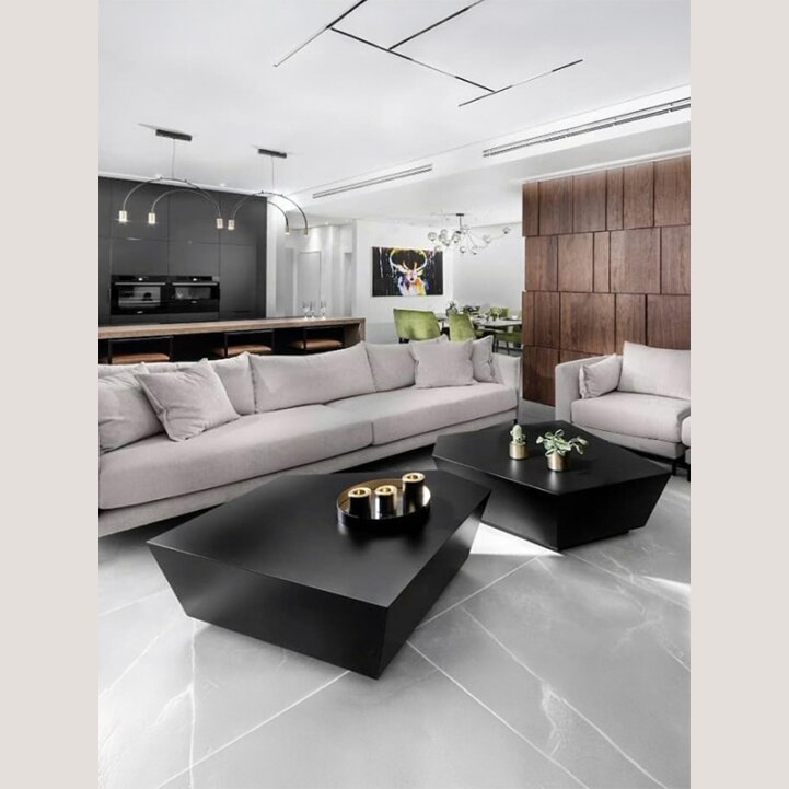 צמד שולחנות בצורת מעויין, בעיצוב מודרני בגימור אפוקסי שחור מט המעניק מראה דרמטי, אלגנטי ומלא סטייל. הקווים הגיאומטריים הנקיים והגימור המוקפד יוצרים פריטים בעלי נוכחות אדריכלית מרשימה, המתאימים לחללים יוקרתיים ומעוצבים בקפידה.
