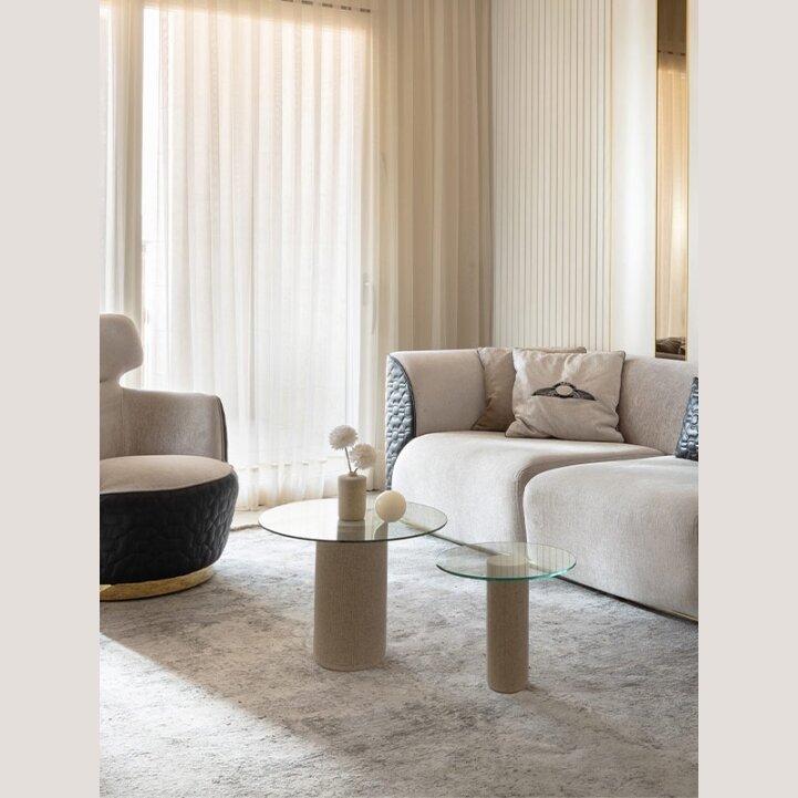 שולחנות צד בעיצוב מודרני עם רגל עגולה אלגנטית ופלטת זכוכית קליר שקופה, היוצרת מראה קליל, נקי ומלא סטייל. הזכוכית הצלולה משתלבת בהרמוניה עם המבנה העגול ומעניקה לחלל תחושת אווריריות ויוקרה.